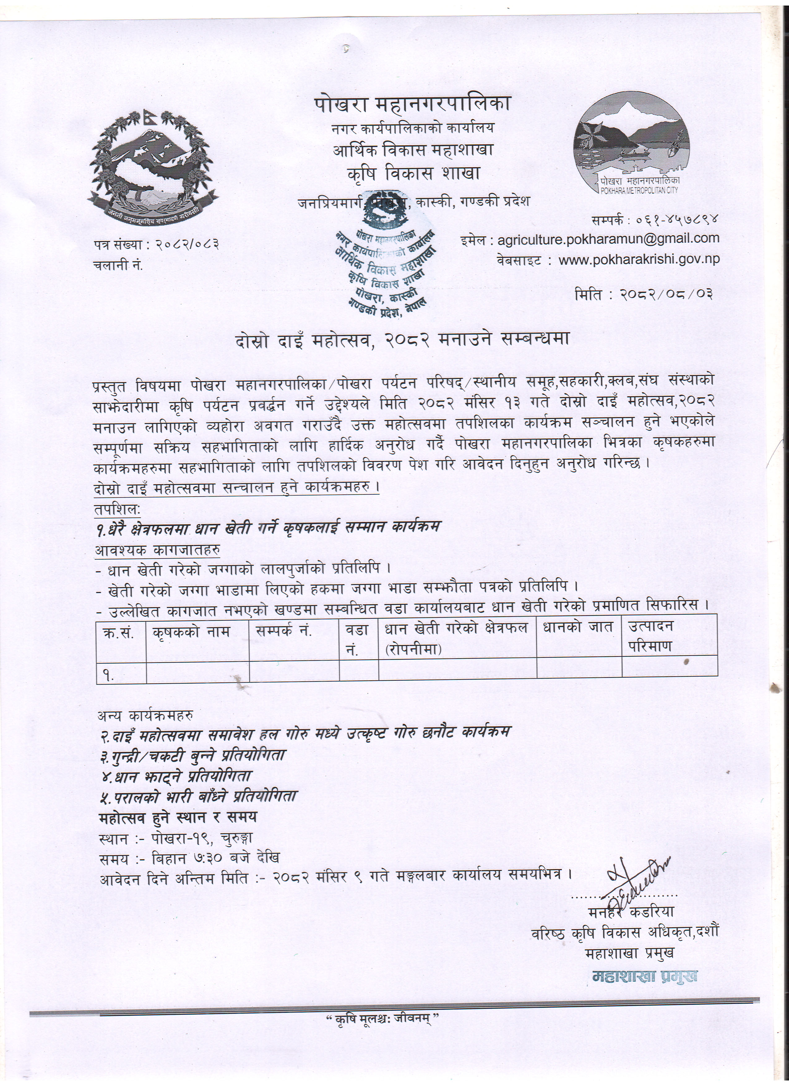 दोस्रो दाइँ महोत्सव,२०८२ मा सहभागिताको लागि आवेदन पेश गर्ने सम्बन्धी सूचना आवेदन दिने अन्तिम मिति २०८२ मङ्सिर ९ गते मंगलबार कार्यालय समयभित्र ||