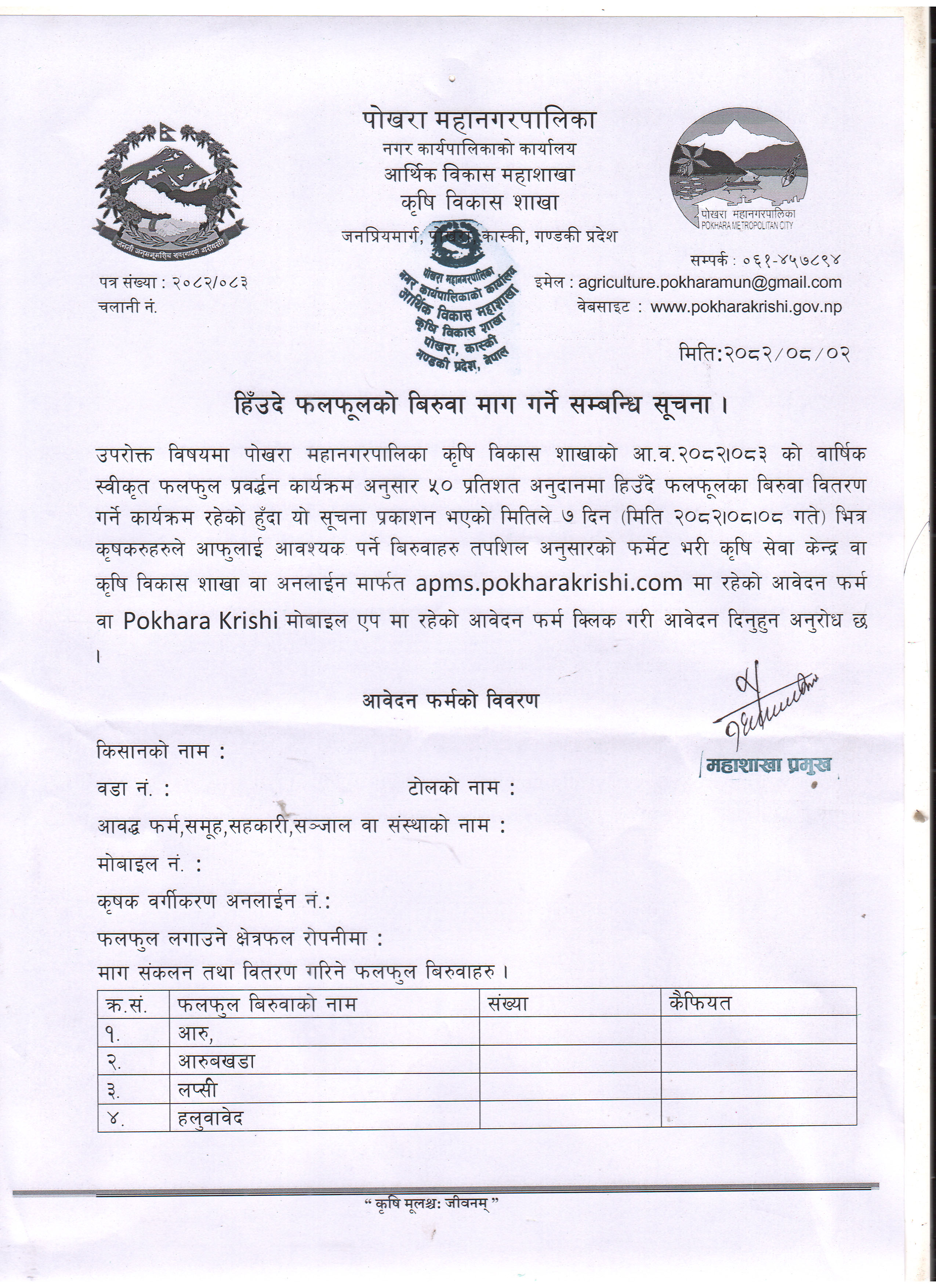 पोखरा महानगरपालिकाको हिउँदे फलफूल बिरुवा माग गर्ने सम्बन्धी सूचना आवेदन दिने अन्तिम मिति २०८२ मङ्सिर ८ गते सोमबार कार्यालय समयभित्र ||