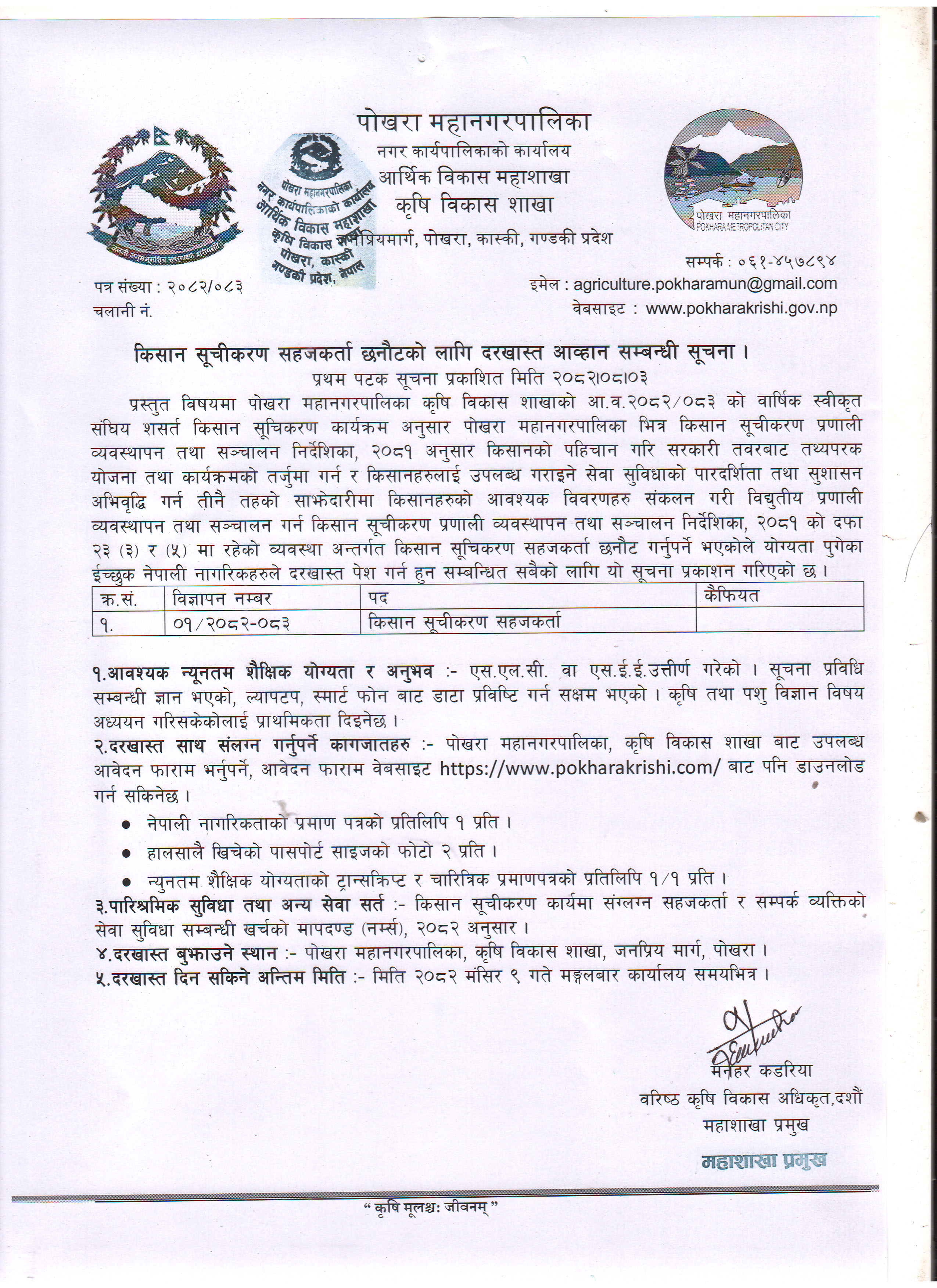 पोखरा महानगरपालिकाको किसान सूचीकरण सहजकर्ता (गणक) छनौटको लागि आवेदन पेश गर्ने सम्बन्धी सूचना आवेदन दिने अन्तिम मिति २०८२ मङ्सिर ९ गते मंगलबार कार्यालय समयभित्र ||