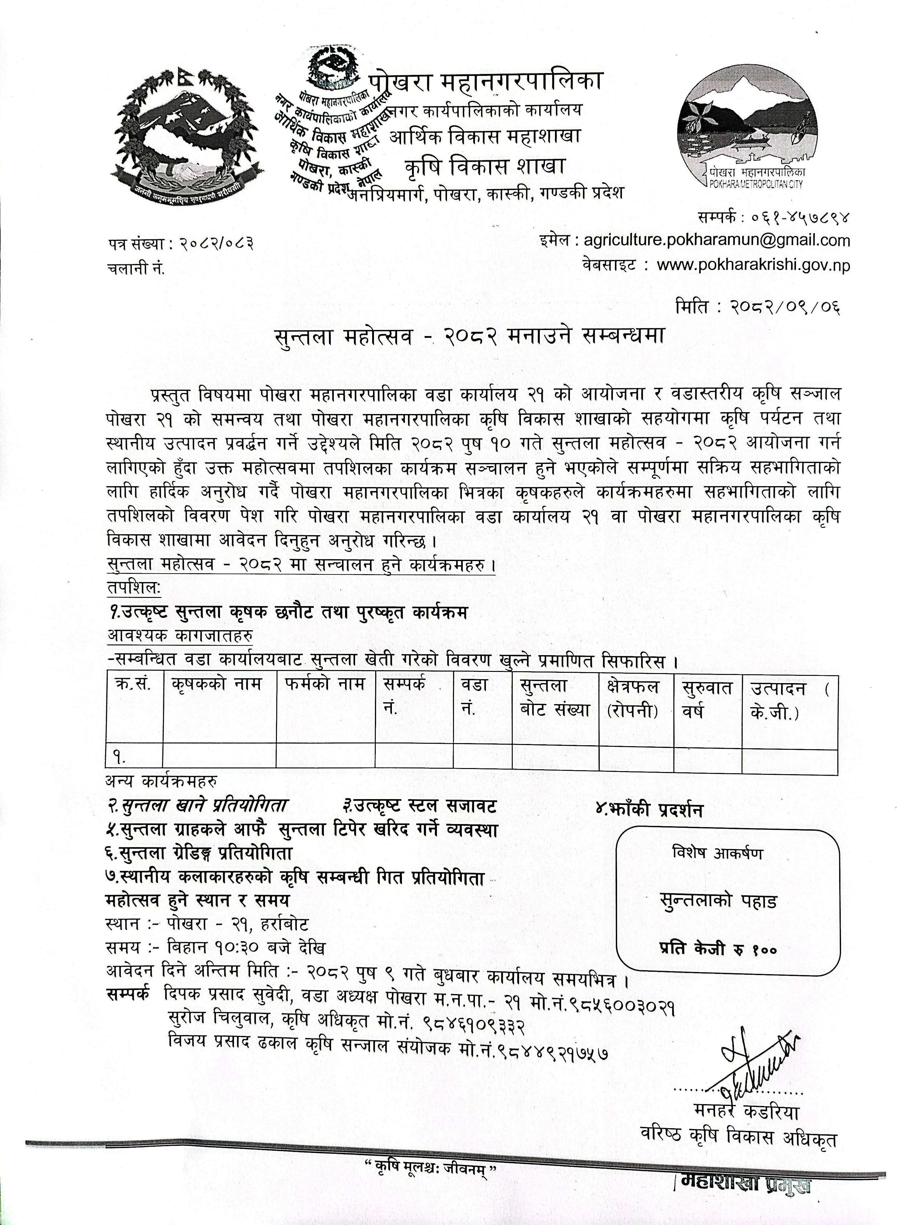 पोखरा महानगरपालिका वडा न १७ स्थित ढुङ्गेसाघुमा आयोजना हुने चौथो राष्ट्रिय कृषि जैविक विविधता दिवसको अवसरमा कन्दमुल प्रदर्शनी प्रतियोगिता सन्चालन सम्बन्धि सूचना ।
